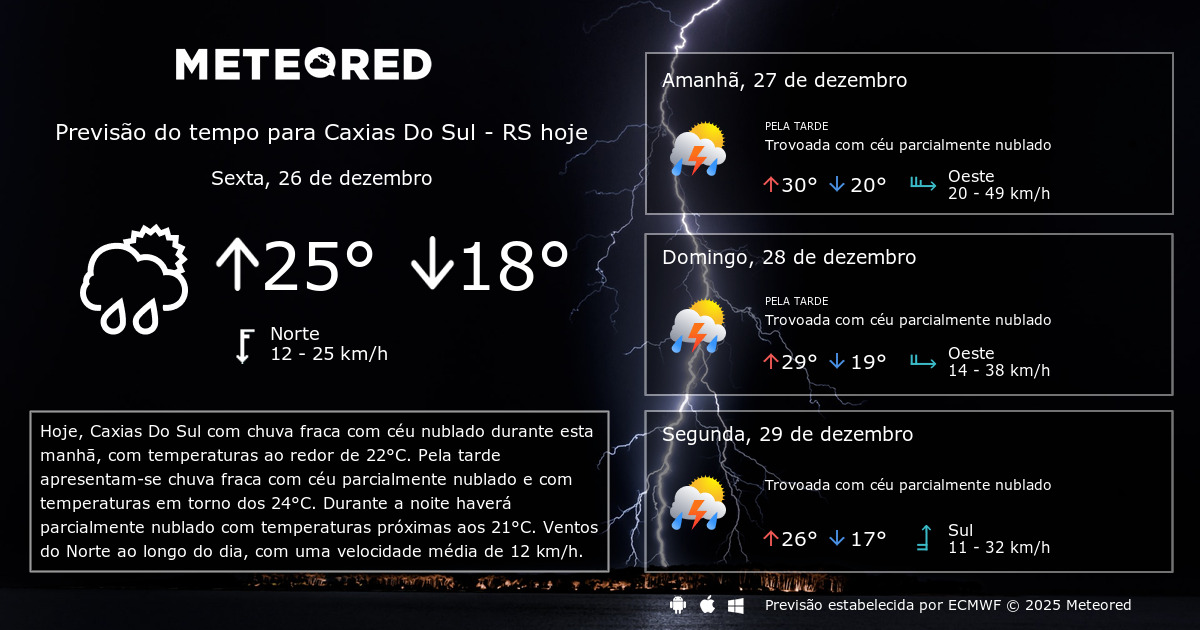 Everything you need to be ready to step out prepared. Get the forecast for today, tonight & tomorrow's weather for caxias do sul, rio grande do sul, brasil. Get the caxias do sul, rio grande do sul, brazil local hourly forecast including temperature, realfeel, and chance of precipitation. Caxias do sul, rio grande do sul 51° f Winds variable at 4 to 8 mph (6.4 to 12.9 kph) (6.4 to 12.9 kph).